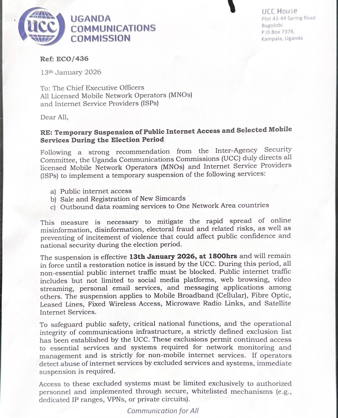 The Uganda Communications Commission (UCC) has ordered a temporary suspension of public internet access and selected mobile services during the election period, effective from 6:00pm on January 13, 2026, ahead of Thursday’s presidential and parliamentary polls.
