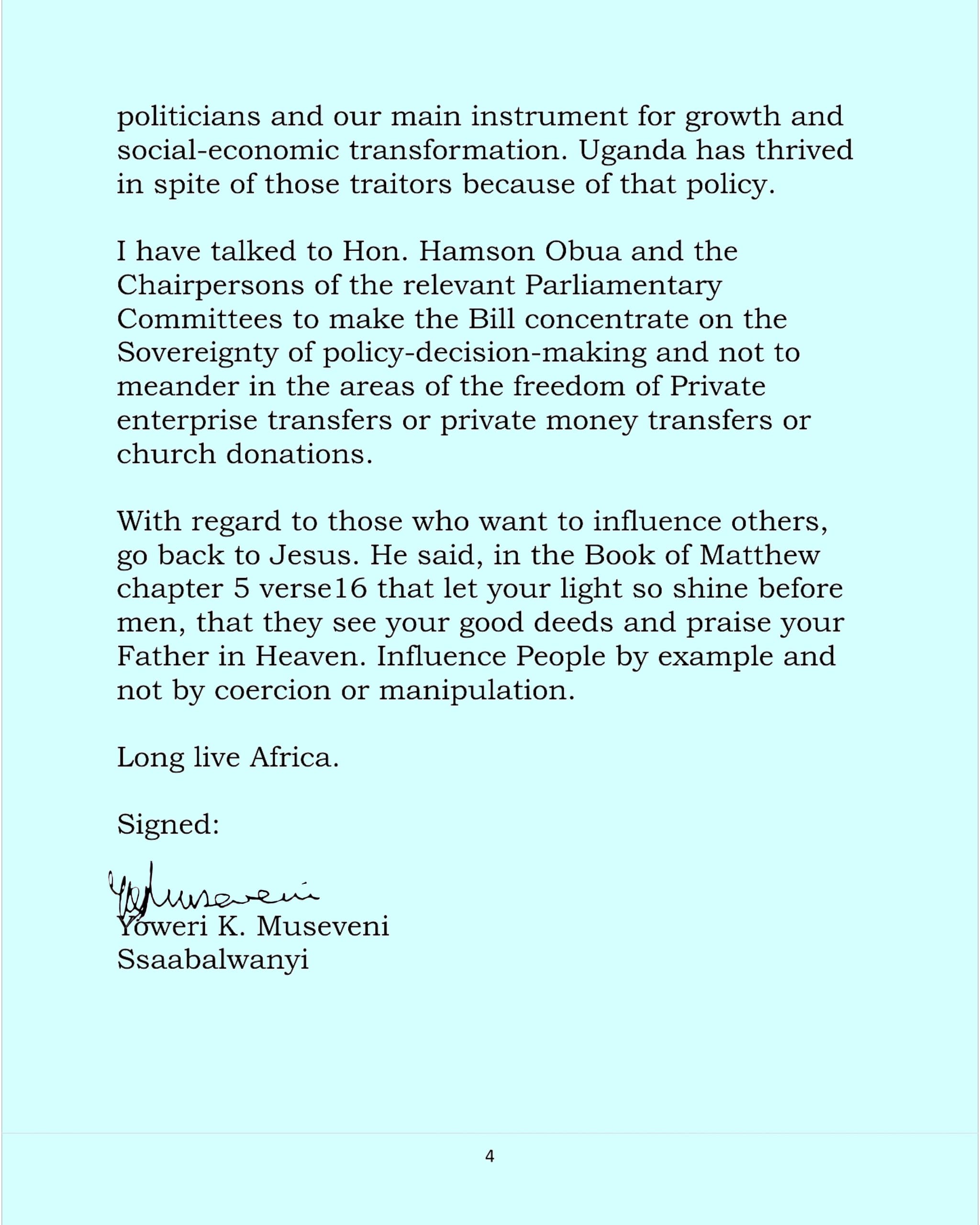 President Yoweri Kaguta Museveni has moved to clarify growing public concern surrounding the proposed Sovereignty Bill, dismissing claims that it targets foreign investment, remittances, or religious support.